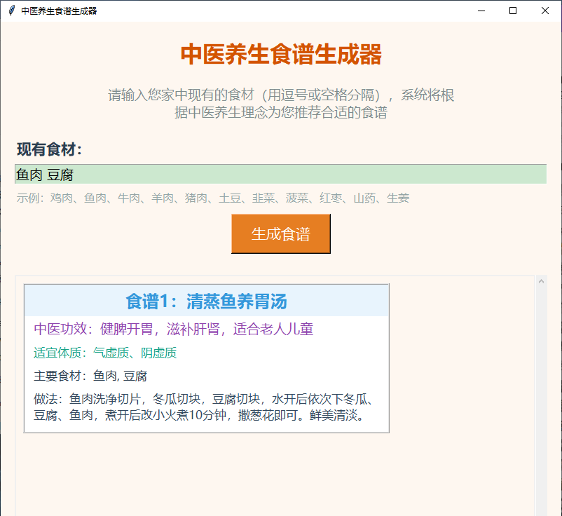 - 根据食材生成中医养生食谱。